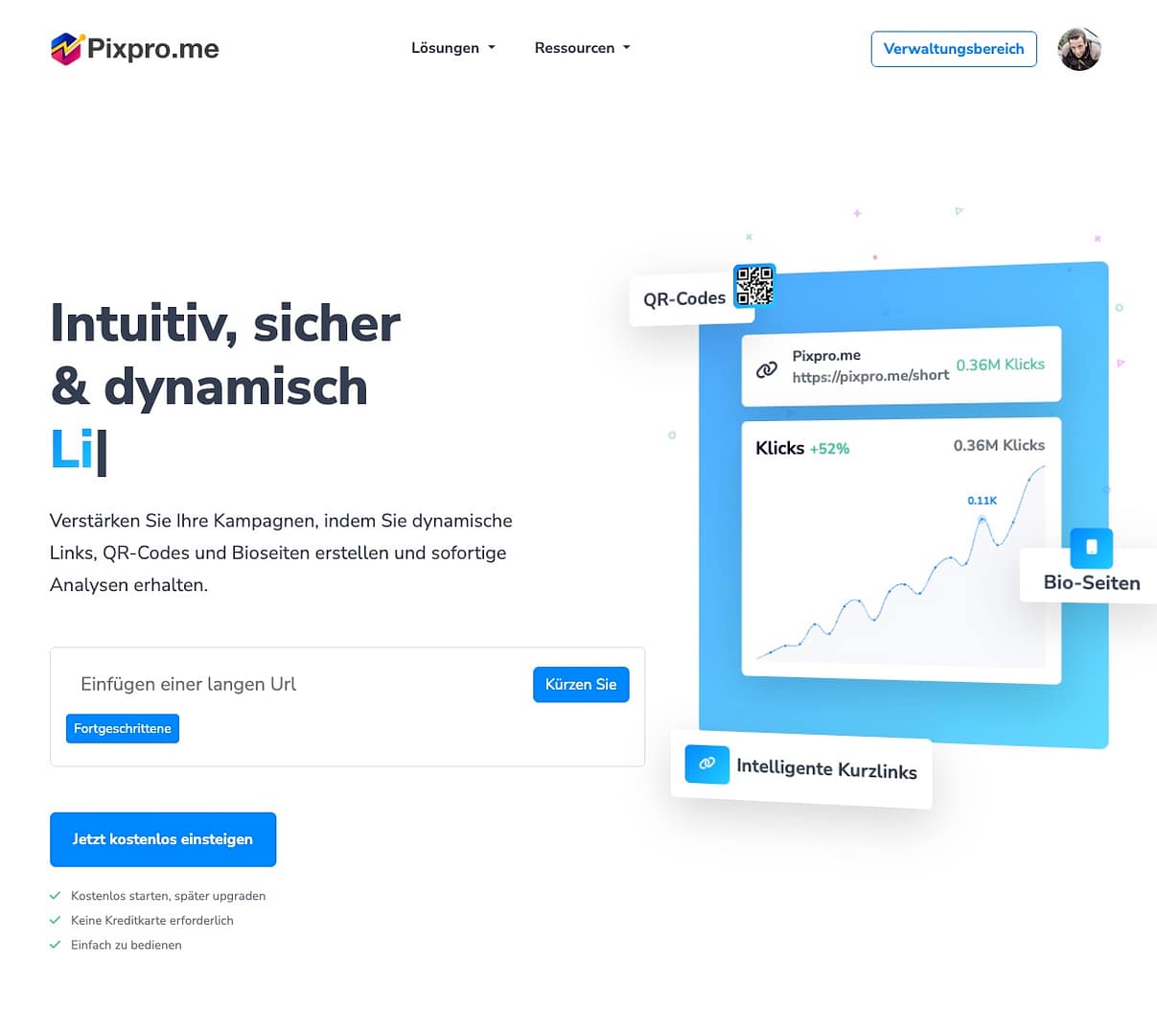 Mit PixPro.me können Sie nicht nur lange URLs in ansprechende Kurzlinks verwandeln, sondern diese auch umfassend verwalten, individuell gestalten und gezielt einsetzen. Ob eigene Domains, Splash-Seiten, QR-Codes, Passwortschutz oder Geo-Targeting – die Plattform bietet eine Vielzahl an Funktionen, die weit über klassische URL-Verkürzer hinausgehen.
